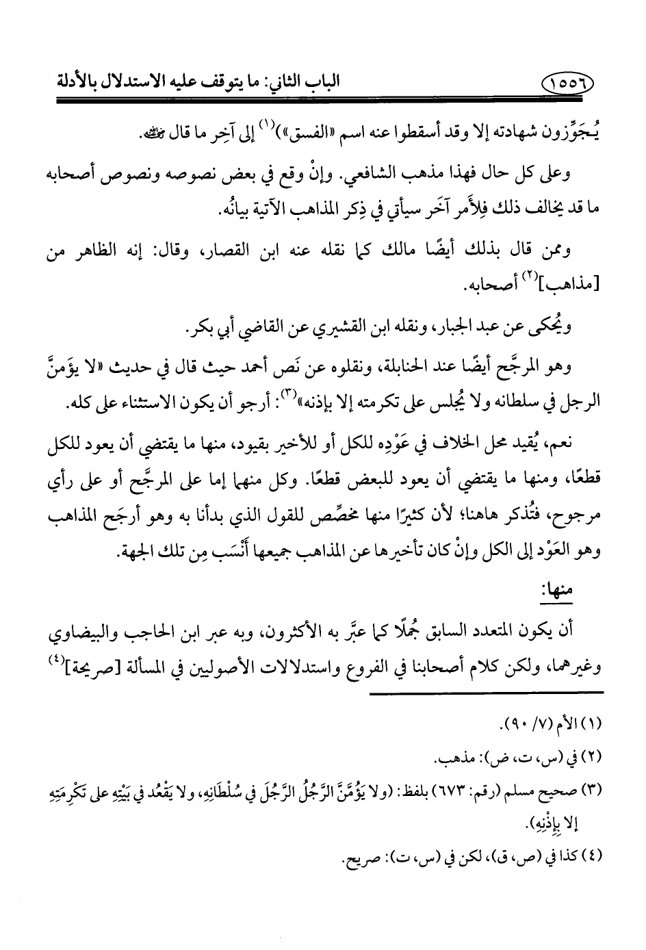 وهو المرجَّح أيضًا عند الحنابلة، ونقلوه عن نَص أحمد حيث قال في حديث "لا يؤَمنَّ الرجل في سلطانه ولا يُجلس على تكرمته إلا بإذنه" (¬٣): أرجو أن يكون الاستثناء على كله. نعم، يُقيد محل الخلاف في عَوْدِه للكل أو للأخير بقيود، منها ما يقتضي أن يعود للكل قطعًا، ومنها ما يقتضي أن يعود للبعض قطعًا. وكل منهما إما على المرجَّح أو على رأي مرجوح، فتُذكر هاهنا؛ لأن كثيرًا منها مخصِّص للقول الذي بدأنا به وهو أرجَح المذاهب وهو العَوْد إلى الكل وإنْ كان تأخيرها عن المذاهب جميعها أَنْسَب مِن تلك الجهة.