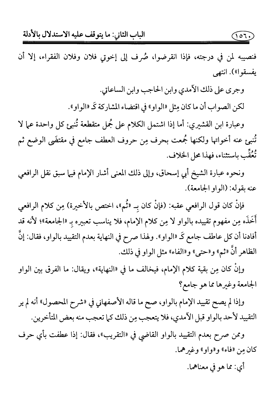 فإنْ كان قول الرافعي عقبه: (فإنْ كان بِـ "ثُم"، اختص بالأخيرة) مِن كلام الرافعي أَخَذَه مِن مفهوم تقييده بالواو لا مِن كلام الإمام، فلا يناسب تعبيره بِـ "الجامعة"؛ لأنه قد أفادنا أن كل عاطف جامع كَـ "الواو". ولهذا صرح في النهاية بعدم التقييد بالواو، فقال: إنَّ الظاهر أنَّ "ثم" و"حتى" و"الفاء" مثل الواو في ذلك.