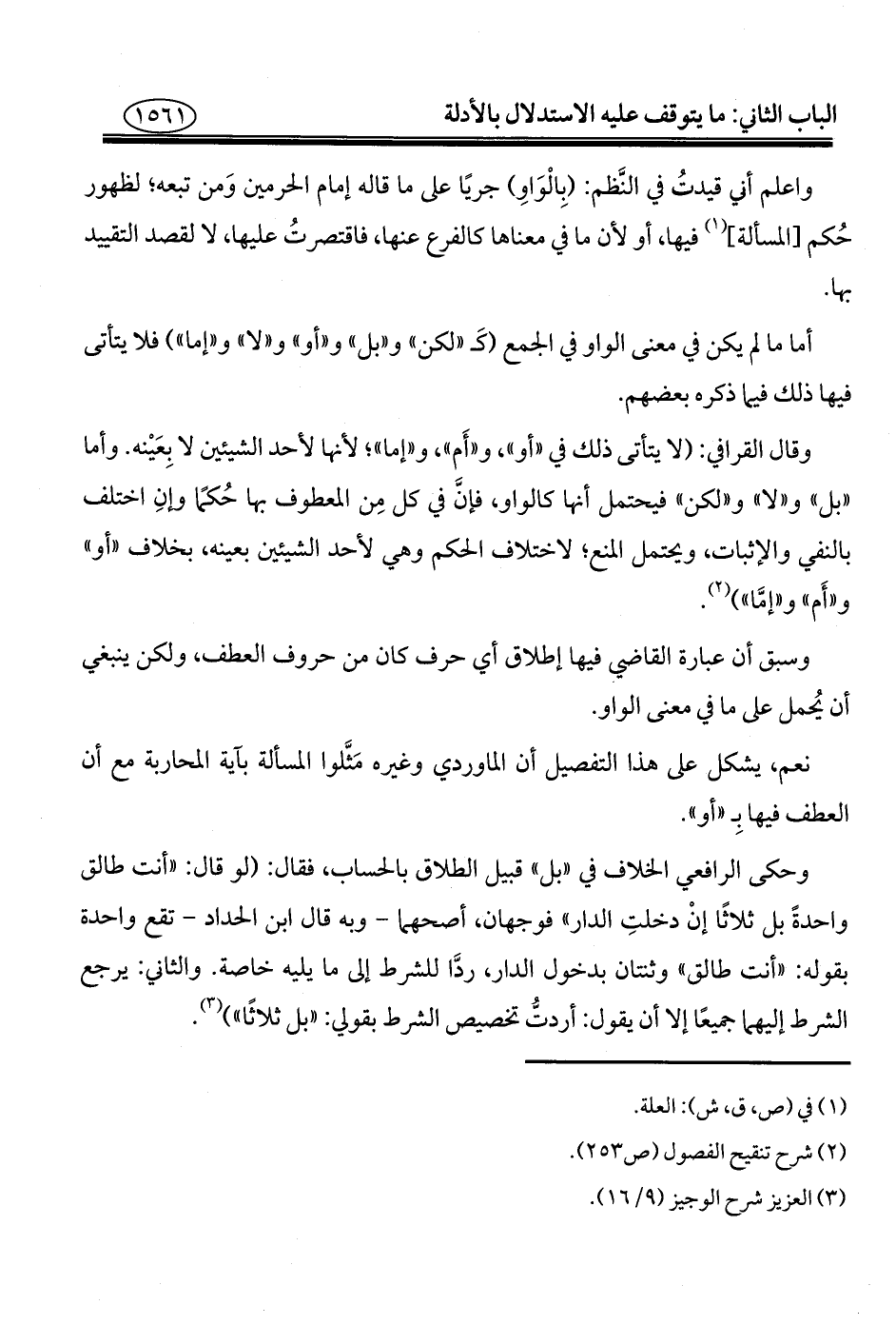 وقال القرافي: (لا يتأتى ذلك في "أو"، و"أَم"، و"إما"؛ لأنها لأحد الشيئين لا بِعَيْنه. وأما "بل" و"لا" و"لكن" فيحتمل أنها كالواو، فإنَّ في كل مِن المعطوف بها حُكمًا وإنِ اختلف بالنفي والإثبات، ويحتمل المنع؛ لاختلاف الحكم وهي لأحد الشيئين بعينه، بخلاف "أو" و"أَم" و"إمَّا") (¬٢).