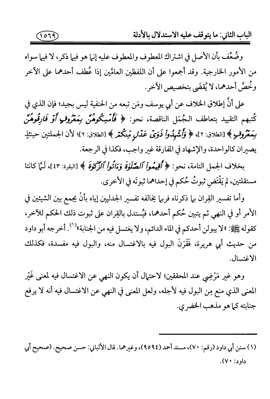 على أنَّ إطلاق الخلاف عن أبي يوسف ومَن تبعه من الحنفية ليس بجيد؛ فإن الذي في كُتبهم التقييد بتعاطف الجُمَل الناقصة، نحو: {فَأَمْسِكُوهُنَّ بِمَعْرُوفٍ أَوْ فَارِقُوهُنَّ بِمَعْرُوفٍ} [الطلاق: ٢]، {وَأَشْهِدُوا ذَوَيْ عَدْلٍ مِنْكُمْ} [الطلاق: ٢]، لأن الجملتين حينئذٍ يصيران كالواحدة، والإشهاد في المفارقة غير واجب، فكذا في الرجعة.