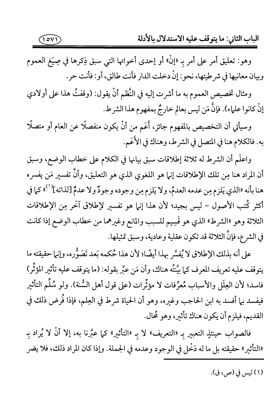 على أنه بذلك الإطلاق لا يُفسَّر بهذا أيضًا؛ لأن هذا حُكمه بَعد تَصَوُّره، وإنما حقيقته ما يتوقف عليه تعريف المعرف كما بيَّنتُه هناك، وأن مَن عبَّر بقوله: (ما يتوقف عليه تأثير المؤثِّر) فاسد؛ لأن العِلَل والأسباب مُعرِّفات لا مؤثِّرات (على قول أهل السُّنة). ولو سُلِّم التأثير فيفسد بما أفسد به ابن الحاجب وغيره، وهو أن الحياة شرط في العِلم، فإذا فُرض ذلك في القديم، فيلزم أن يكون هناك تأثير، وهو محُال.