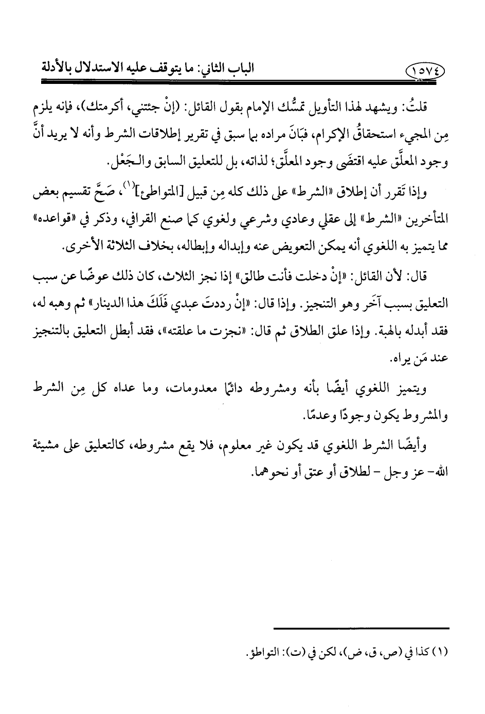 قلتُ: ويشهد لهذا التأويل تمسُّك الإمام بقول القائل: (إنْ جئتني، أكرمتك)، فإنه يلزم مِن المجيء استحقاقُ الإكرام، فبَانَ مراده بما سبق في تقرير إطلاقات الشرط وأنه لا يريد أنَّ وجود المعلَّق عليه اقتضَى وجود المعلَّق؛ لذاته، بل للتعليق السابق والجَعْل.