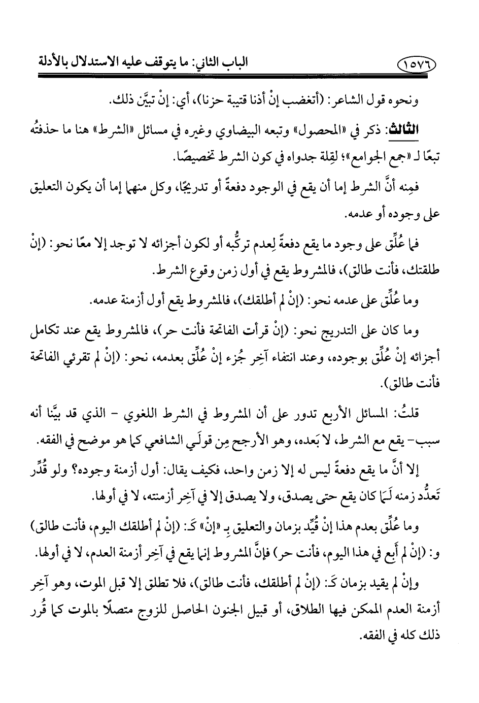 الثالث: ذكر في "المحصول" وتبعه البيضاوي وغيره في مسائل "الشرط" هنا ما حذفتُه تبعًا لـ "جمع الجوامع"؛ لقِلة جدواه في كون الشرط تخصيصًا.