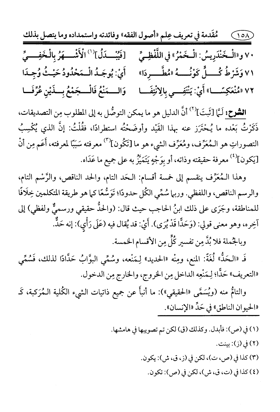 وهذا المُعَرِّف ينقسم إلى خمسة أقسام: الحَد التام، والحد الناقص، والرَّسْم التام، والرسم الناقص، واللفظي. وربما سُمِّي الكُل حدودًا؛ تَوَسُّعًا كما هو طريقة المتكلمين خِلَافًا للمناطقة، وجَرَى على ذلك ابنُ الحاجب حيث قال: (والحدُّ حقيقي ورسميٌّ ولفظي) إلى آخِره، وهو معنى قولي: (وَحَدًّا قَدْ يُرَى). أَيْ: قد يُقال فيه (عَلَى رَأْيٍ): إنه حَدٌّ.