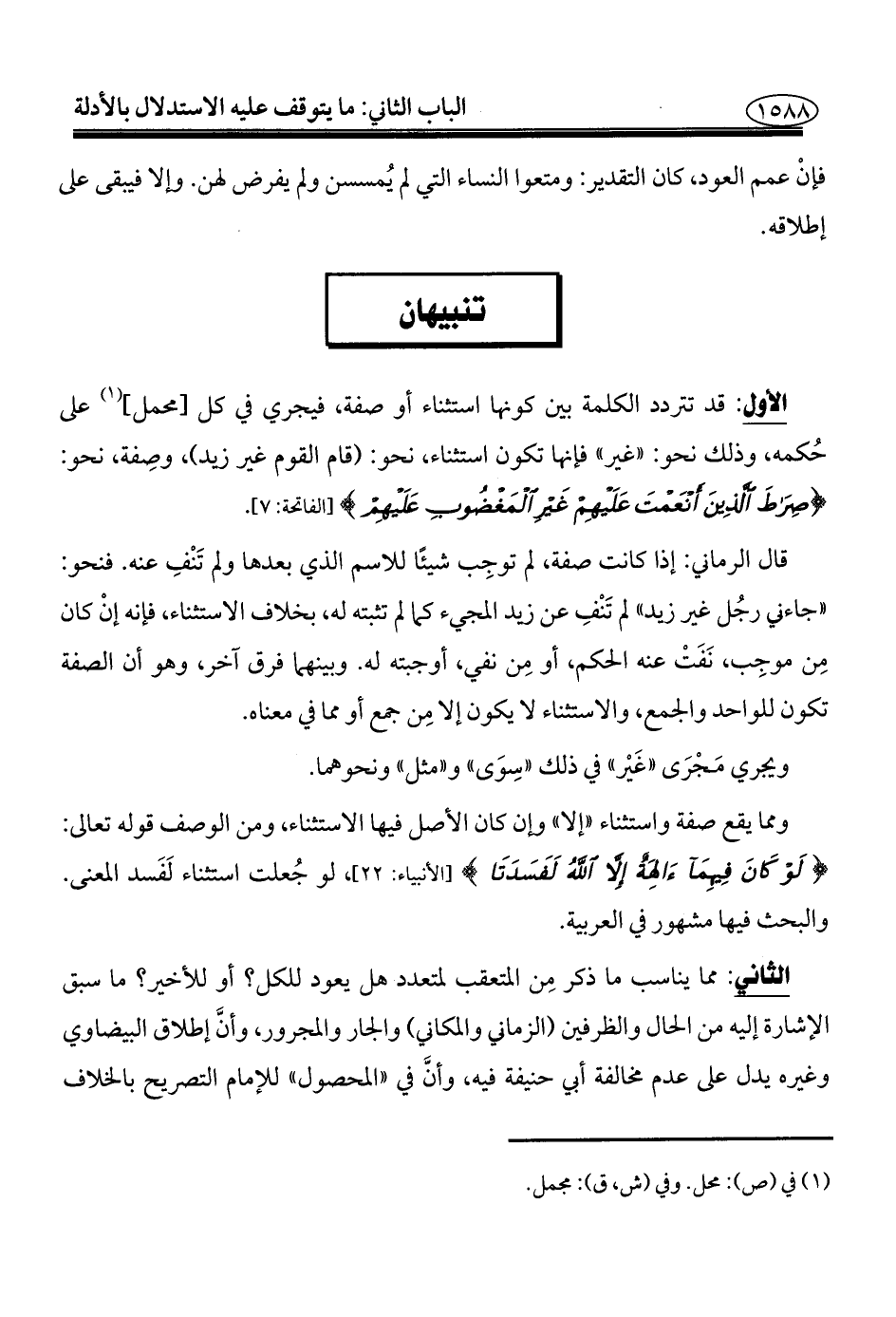 الأول: قد تتردد الكلمة بين كونها استثناء أو صفة، فيجري في كل [محمل] (¬١) على حُكمه، وذلك نحو: "غير" فإنها تكون استثناء، نحو: (قام القوم غير زيد)، وصِفة، نحو: {صِرَاطَ الَّذِينَ أَنْعَمْتَ عَلَيْهِمْ غَيْرِ الْمَغْضُوبِ عَلَيْهِمْ} [الفاتحة: ٧].