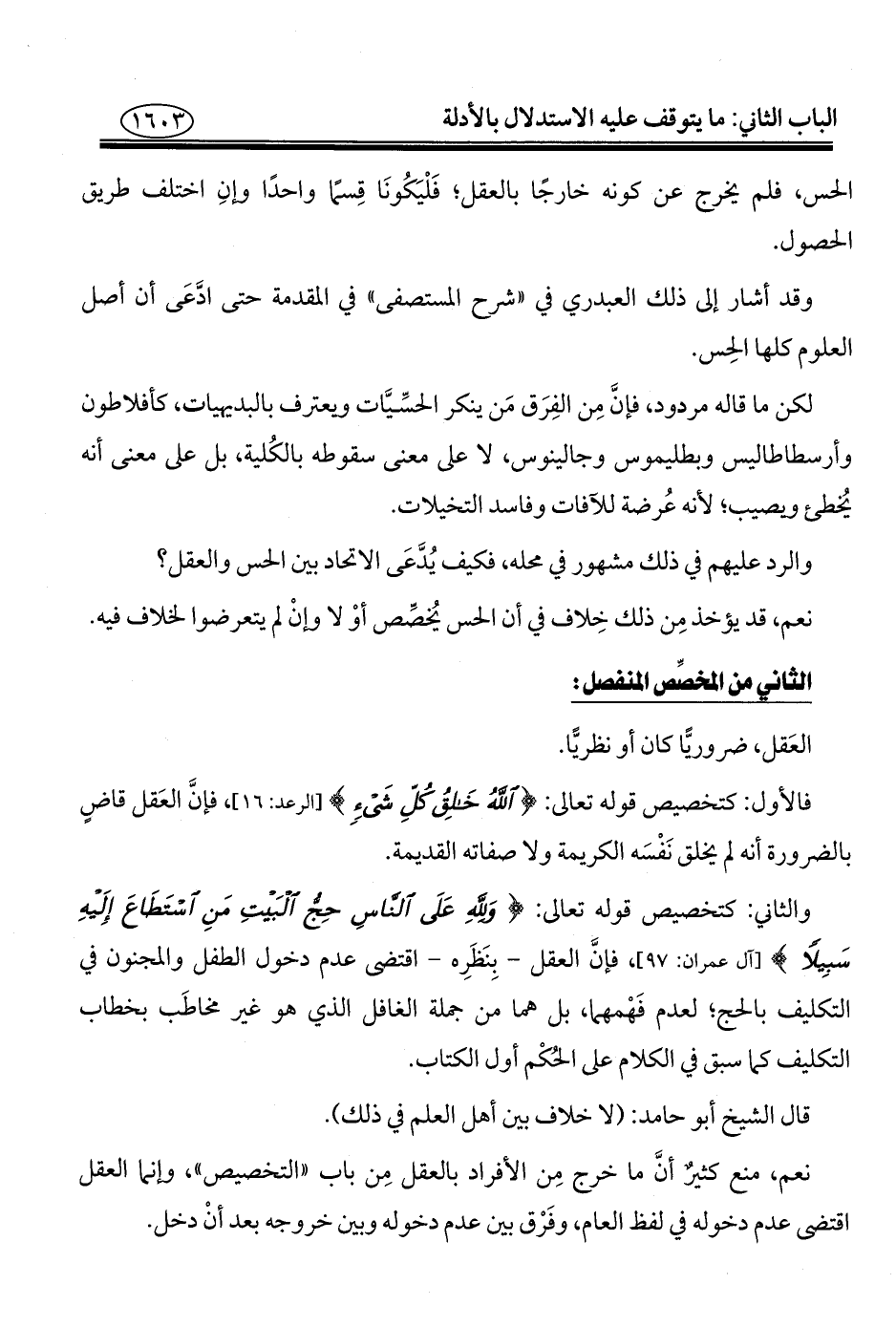 والثاني: كتخصيص قوله تعالى: {وَلِلَّهِ عَلَى النَّاسِ حِجُّ الْبَيْتِ مَنِ اسْتَطَاعَ إِلَيْهِ سَبِيلًا} [آل عمران: ٩٧]، فإنَّ العقل -بِنَظَرِه - اقتضى عدم دخول الطفل والمجنون في التكليف بالحج؛ لعدم فَهْمهما، بل هما من جملة الغافل الذي هو غير مخاطَب بخطاب التكليف كما سبق في الكلام على الحُكْم أول الكتاب.