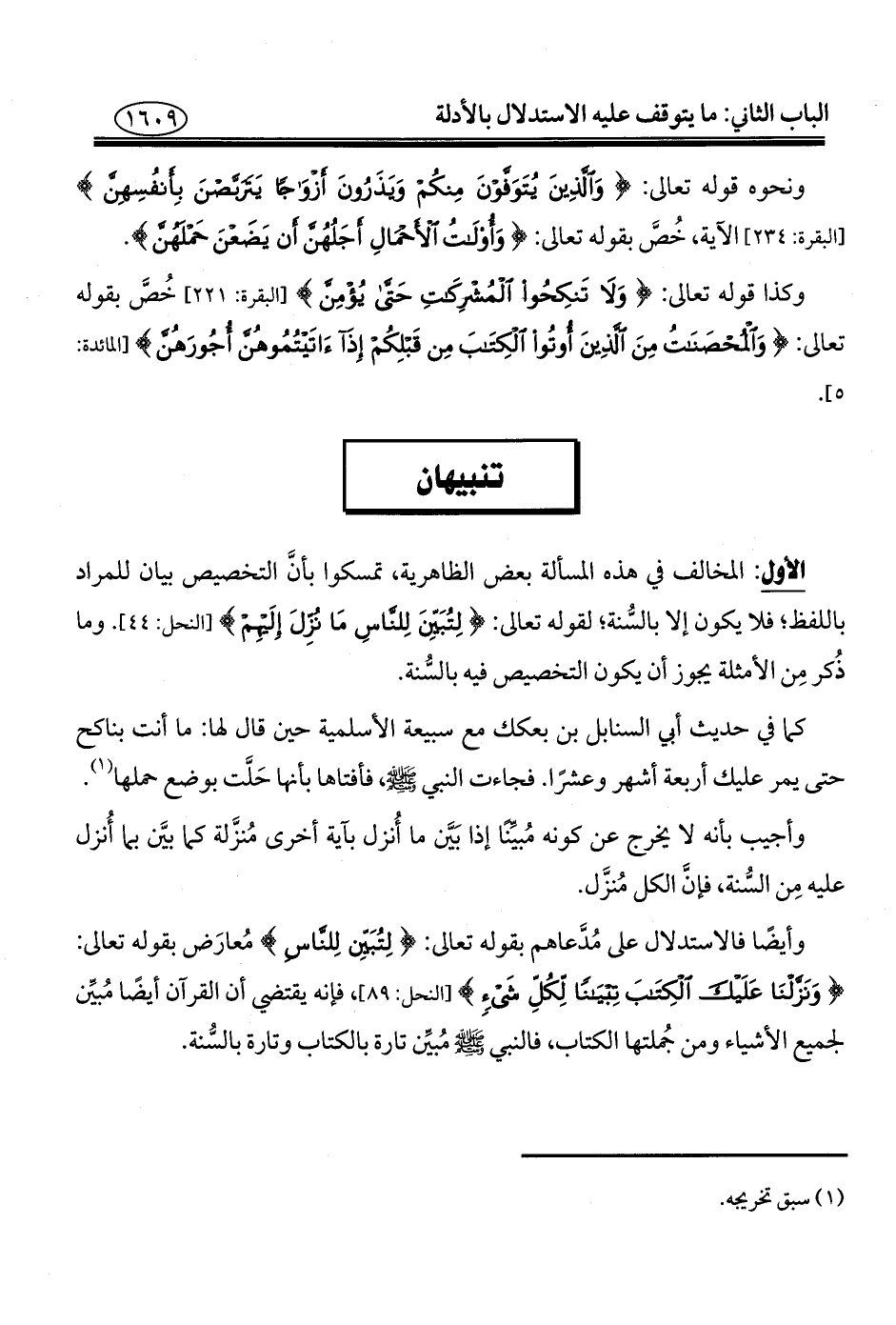 وأيضًا فالاستدلال على مُدَّعاهم بقوله تعالى: {لِتُبَيِّنَ لِلنَّاسِ} مُعارَض بقوله تعالى: {وَنَزَّلْنَا عَلَيْكَ الْكِتَابَ تِبْيَانًا لِكُلِّ شَيْءٍ} [النحل: ٨٩]، فإنه يقتضي أن القرآن أيضًا مُبيِّن لجميع الأشياء ومن جُملتها الكتاب، فالنبي - صلى الله عليه وسلم - مُبيِّن تارة بالكتاب وتارة بالسُّنة.
