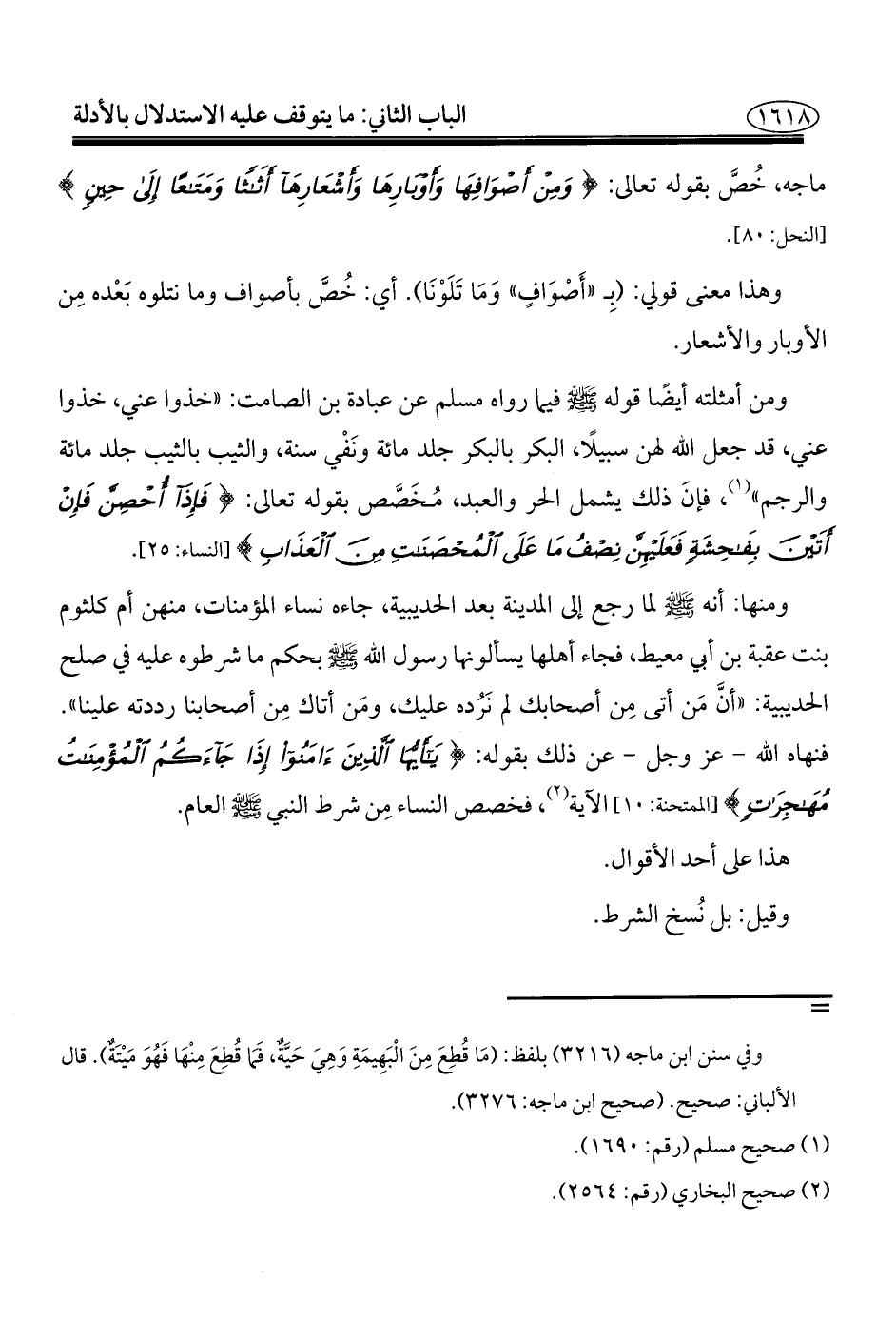 ماجه، خُصَّ بقوله تعالى: {وَمِنْ أَصْوَافِهَا وَأَوْبَارِهَا وَأَشْعَارِهَا أَثَاثًا وَمَتَاعًا إِلَى حِينٍ} [النحل: ٨٠].