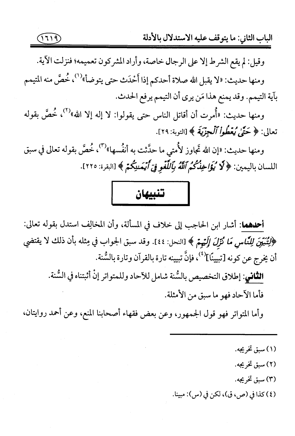 أحدهما: أشار ابن الحاجب إلى خلاف في المسألة، وأن المخالِف استدل بقوله تعالى: {لِتُبَيِّنَ لِلنَّاسِ مَا نُزِّلَ إِلَيْهِمْ} [النحل: ٤٤]. وقد سبق الجواب في مِثله بأن ذلك لا يقتضي أن يخرج عن كونه [تبيينًا] (¬٤)، فإنَّ تبيينه تارة بالقرآن وتارة بالسُّنة.