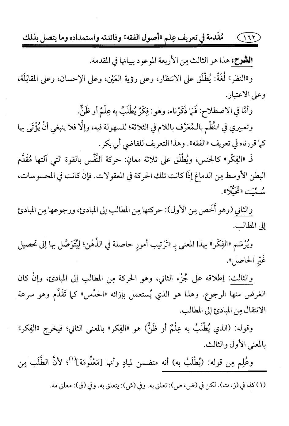 والثالث: إطلاقه على جُزْء الثاني، وهو الحركة مِن المطالب إلى المبادئ، وإنْ كان الغرض منها الرجوع. وهذا هو الذي يُستعمل بإزائه "الحدْس" كما تَقَدَّم وهو سرعة الانتقال مِن المبادئ إلى المطالب.