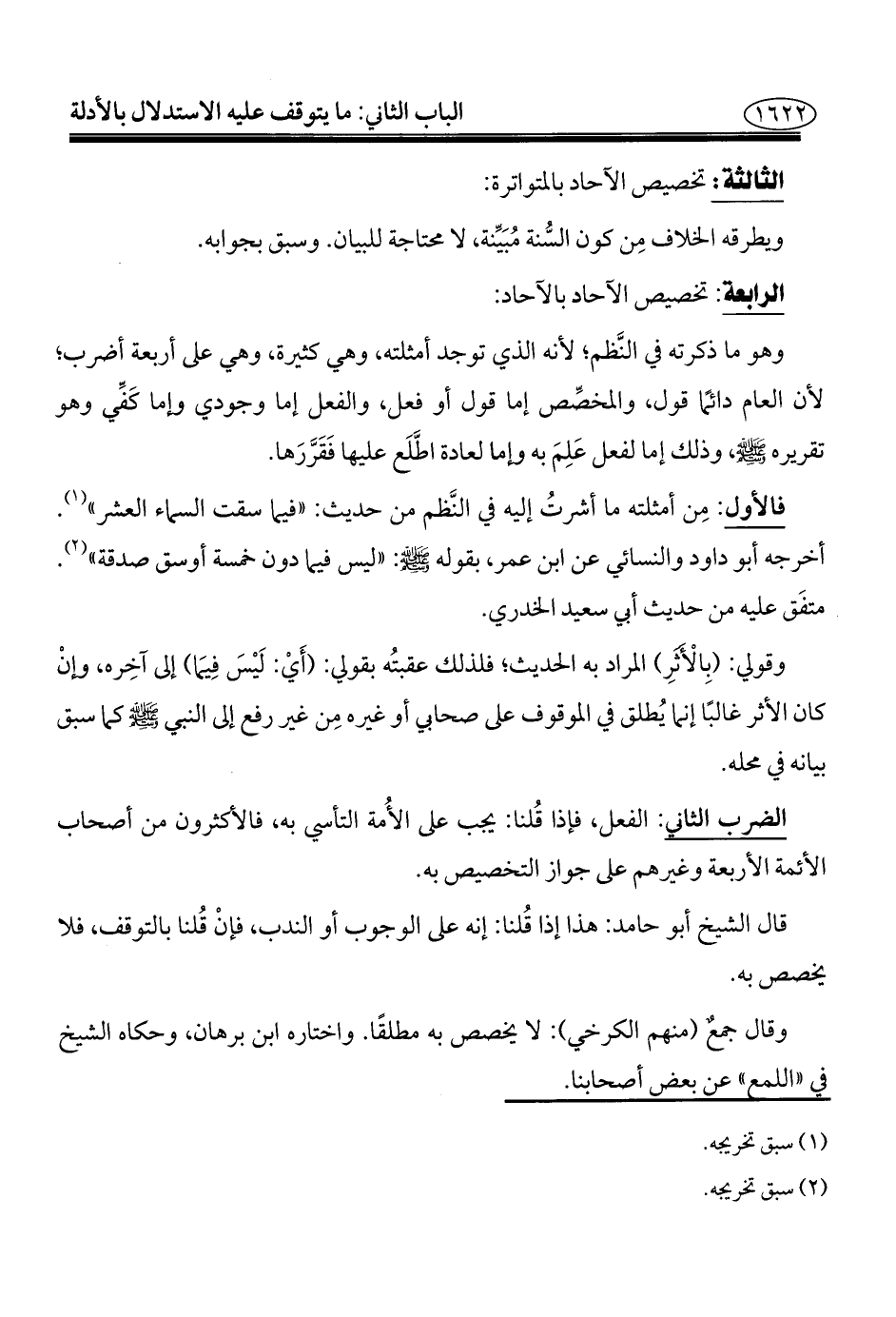 فالأول: مِن أمثلته ما أشرتُ إليه في النَّظم من حديث: "فيما سقت السماء العشر" (¬١). أخرجه أبو داود والنسائي عن ابن عمر، بقوله - صلى الله عليه وسلم -: "ليس فيما دون خمسة أوسق صدقة" (¬٢). متفَق عليه من حديث أبي سعيد الخدري.