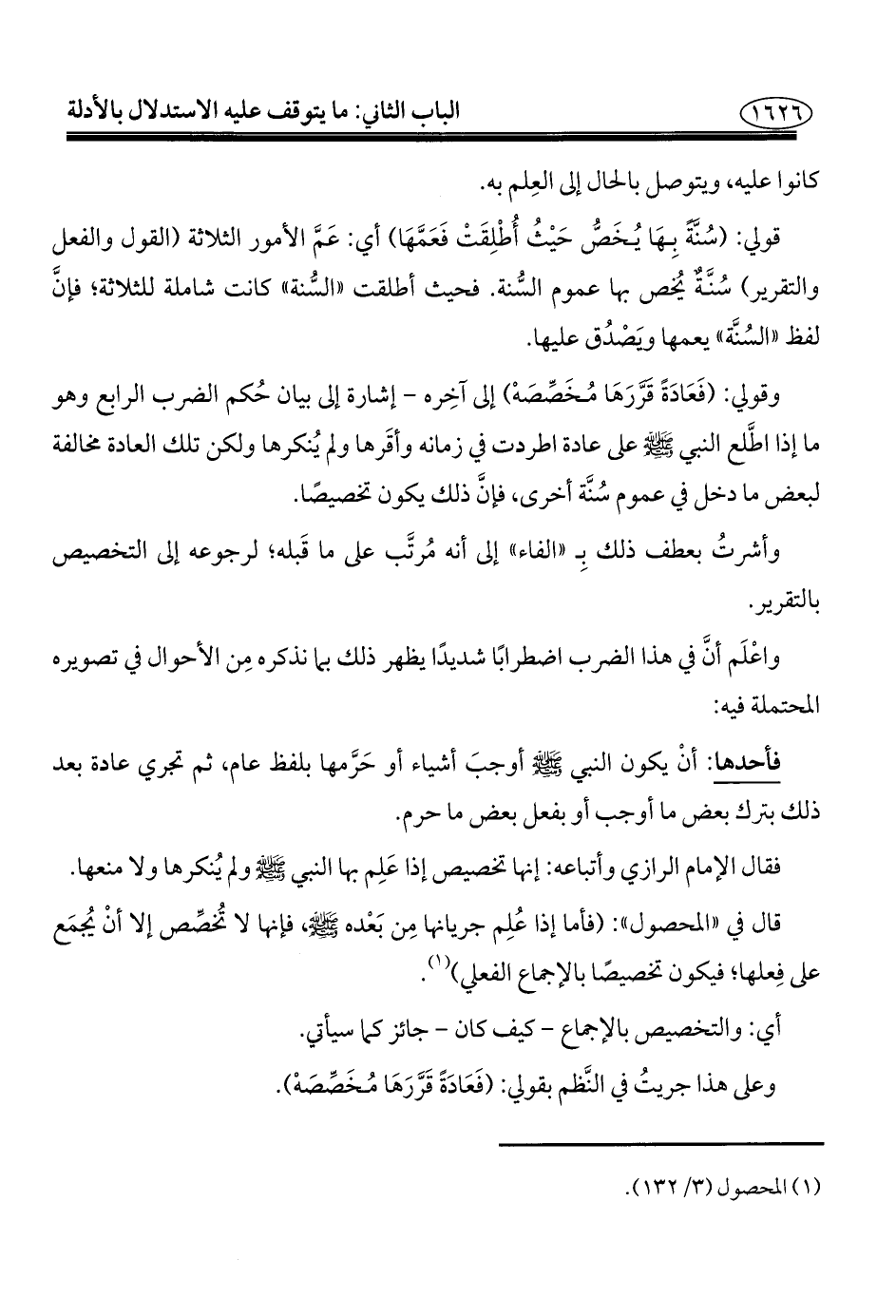 وقولي: (فَعَادَةً قرَّرَهَا مُخَصِّصَهْ) إلى آخِره -إشارة إلى بيان حُكم الضرب الرابع وهو ما إذا اطَّلع النبي - صلى الله عليه وسلم - على عادة اطردت في زمانه وأقَرها ولم يُنكرها ولكن تلك العادة مخالفة لبعض ما دخل في عموم سُنَّة أخرى، فإنَّ ذلك يكون تخصيصًا.
