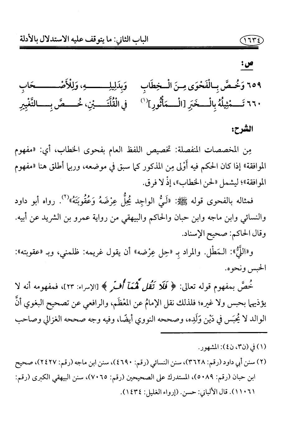 فمثاله بالفحوى قوله - صلى الله عليه وسلم -: "لَيُّ الواجِد يُحِلُّ عِرْضَهُ وَعُقُوبَتَهُ" (¬٢). رواه أبو داود والنسائي وابن ماجه وابن حبان والحاكم والبيهقي من رواية عمرو بن الشريد عن أبيه. وقال الحاكم: صحيح الإسناد.