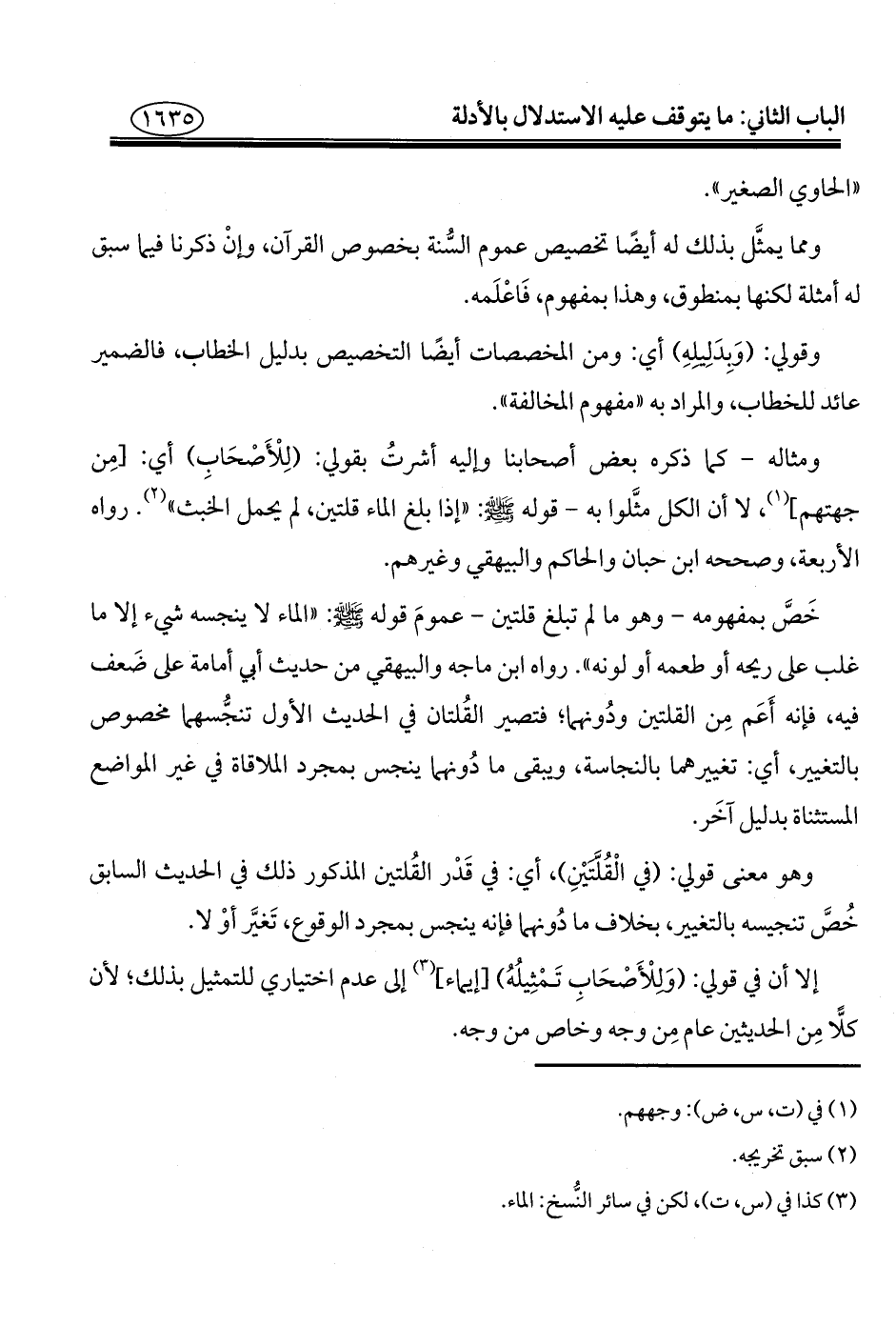 خَصَّ بمفهومه -وهو ما لم تبلغ قلتين- عمومَ قوله - صلى الله عليه وسلم -: "الماء لا ينجسه شيء إلا ما غلب على ريحه أو طعمه أو لونه". رواه ابن ماجه والبيهقي من حديث أبي أمامة على ضَعف فيه، فإنه أَعَم مِن القلتين ودُونهما؛ فتصير القُلتان في الحديث الأول تنجُّسهما مخصوص بالتغيير، أي: تغييرهما بالنجاسة، ويبقى ما دُونهما ينجس بمجرد الملاقاة في غير المواضع المستثناة بدليل آخَر.