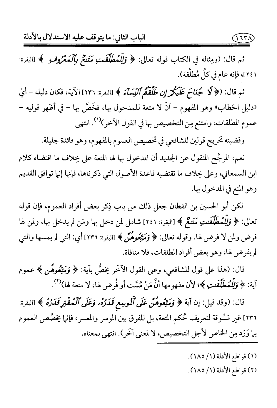 ثم قال: (ومثاله في الكتاب قوله تعالى: {وَلِلْمُطَلَّقَاتِ مَتَاعٌ بِالْمَعْرُوفِ} [البقرة: ٢٤١]، فإنه عام في كلِّ مُطلَّقة).