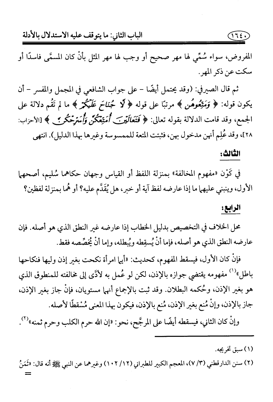 ثم قال الصيرفي: (وقد يحتمل أيضًا -على جواب الشافعي في المجمل والمفسر- أن يكون قوله: {وَمَتِّعُوهُنَّ} مرتبًا على قوله {لَا جُنَاحَ عَلَيْكُمْ} ما لم تَقُم دلالة على الجمع، وقد قامت الدلالة بقوله تعالى: {فَتَعَالَيْنَ أُمَتِّعْكُنَّ وَأُسَرِّحْكُنَّ} [الأحزاب: ٢٨]، وقد عُلِم أنهن مدخول بهن، فثبتت المتعة للممسوسة وغيرها بهذا الدليل). انتهى