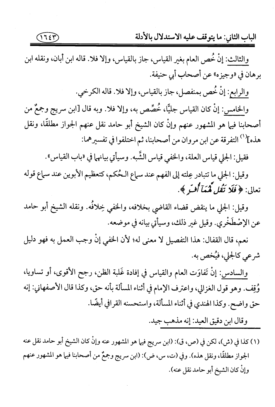 والخامس: إنْ كان القياس جليًّا، خُصِّص به، وإلا فلا. وبه قال [ابن سريج وجمعٌ من أصحابنا فيما هو المشهور عنهم وإنْ كان الشيخ أبو حامد نقل عنهم الجواز مطلقًا، ونقل هذه] (¬١) التفرقة عن ابن مروان من أصحابنا، ثم اختلفوا في تفسيرهما: