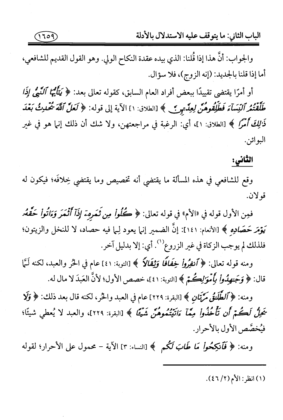 فمِن الأول قوله في "الأم" في قوله تعالى: {كُلُوا مِنْ ثَمَرِهِ إِذَا أَثْمَرَ وَآتُوا حَقَّهُ يَوْمَ حَصَادِهِ} [الأنعام: ١٤١]: إنَّ الضمير إنما يعود لِما فيه حصاد، لا للنخل والزيتون؛ فلذلك لم يوجب الزكاة في غير الزروع (¬١). أي: إلا بدليل آخر.