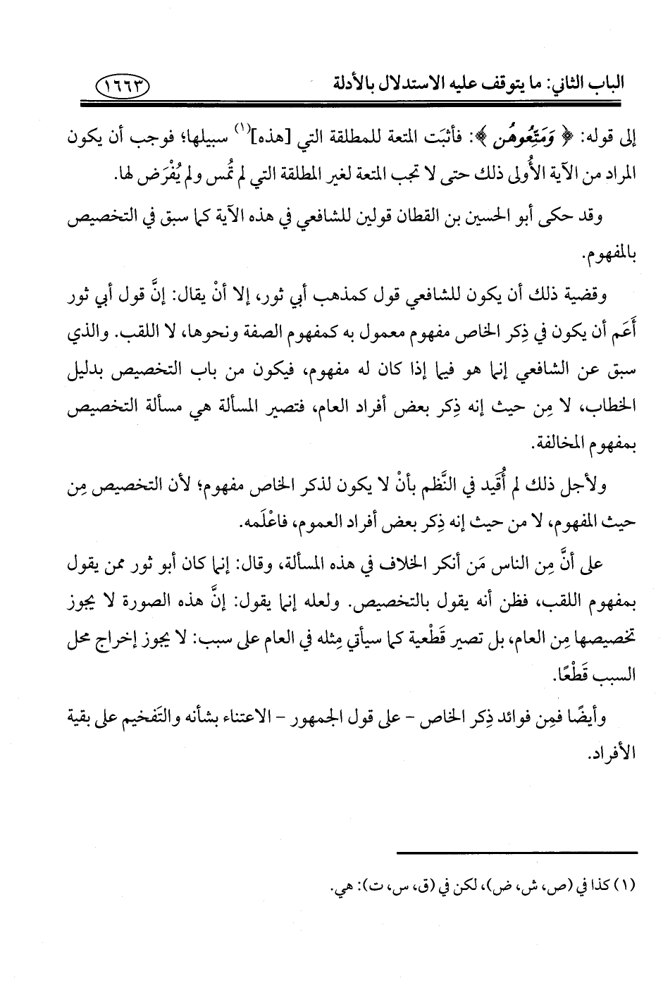 على أنَّ مِن الناس مَن أنكر الخلاف في هذه المسألة، وقال: إنما كان أبو ثور ممن يقول بمفهوم اللقب، فظن أنه يقول بالتخصيص. ولعله إنما يقول: إنَّ هذه الصورة لا يجوز تخصيصها مِن العام، بل تصير قَطْعية كما سيأتي مِثله في العام على سبب: لا يجوز إخراج محل السبب قَطْعًا.
