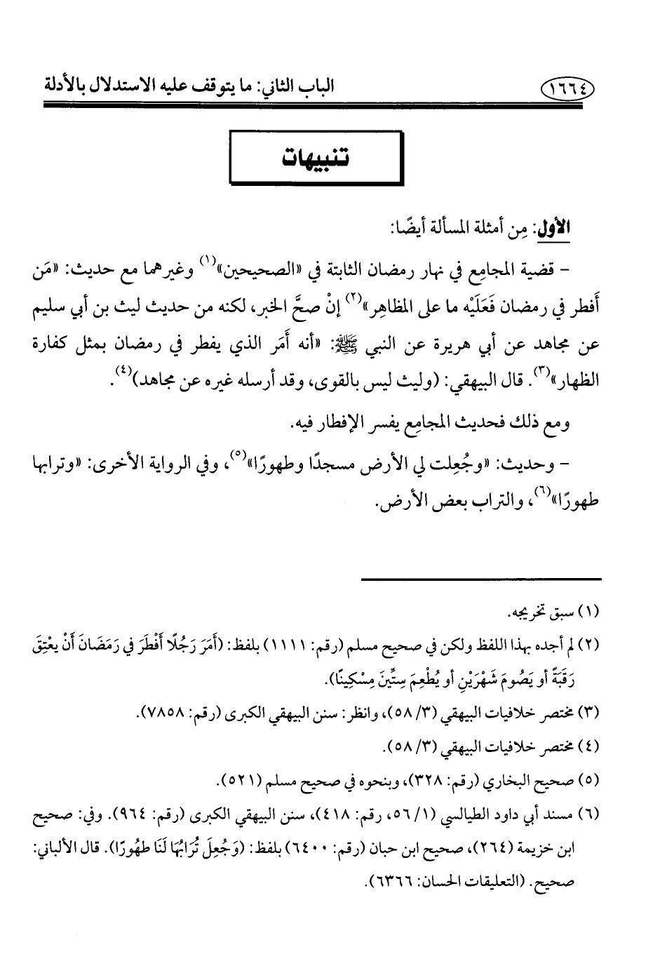 (¬٦) مسند أبي داود الطيالسي (١/ ٥٦، رقم: ٤١٨)، سنن البيهقي الكبرى (رقم: ٩٦٤). وفي: صحيح ابن خزيمة (٢٦٤)، صحيح ابن حبان (رقم: ٦٤٠٠) بلفظ: (وَجُعِلَ ترَابُهَا لَنَا طهُورًا). قال الألباني: صحيح. (التعليقات الحسان: ٦٣٦٦).