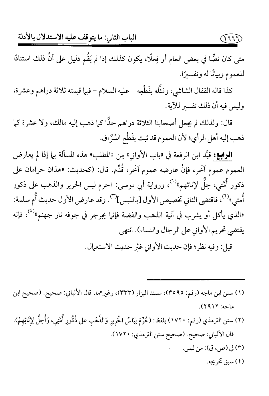 الرابع: قيَّد ابن الرفعة في "باب الأواني" مِن "المطلب" هذه المسألة بما إذا لم يعارض العموم عموم آخَر، فإنْ عارضه عموم آخَر، قُدِّم. قال: (كحديث: "هذان حرامان على ذكور أُمَّتي، حِلٌّ لإناثهم" (¬١)، ورواية أبي موسى: "حرم لبس الحرير والذهب على ذكور أُمتي" (¬٢)، فاقتضى الثاني تخصيص الأول [باللبس] (¬٣). وقد عارض الأول حديث أُم سلمة: "الذي يأكل أو يشرب في آنية الذهب والفضة فإنما يجرجر في جوفه نار جهنم" (¬٤)، فإنه يقتضي تحريم الأواني على الرجال والنساء). انتهى