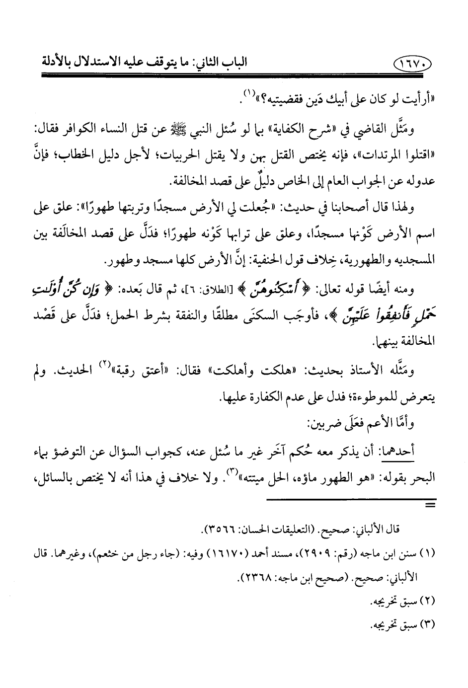 ومنه أيضًا قوله تعالى: {أَسْكِنُوهُنَّ} [الطلاق: ٦] , ثم قال بَعده: {وَإِنْ كُنَّ أُولَاتِ حَمْلٍ فَأَنْفِقُوا عَلَيْهِنَّ}، فأوجَب السكنَى مطلقًا والنفقة بشرط الحمل؛ فدَلَّ على قَصْد المخالفة بينهما.