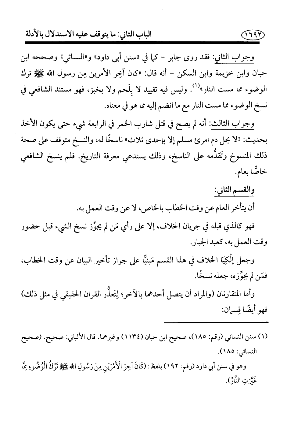 وجواب الثاني: فقد روى جابر -كما في "سنن أبي داود" و "النسائي" وصححه ابن حبان وابن خزيمة وابن السكن- أنه قال: "كان آخِر الأمرين مِن رسول الله - صلى الله عليه وسلم - ترك الوضوء مما مست النار" (¬١). وليس فيه تقييد لا بِلَحم ولا بخبز، فهو مستند الشافعي في نسخ الوضوء مما مست النار مع ما انضم إليه مما هو في معناه.
