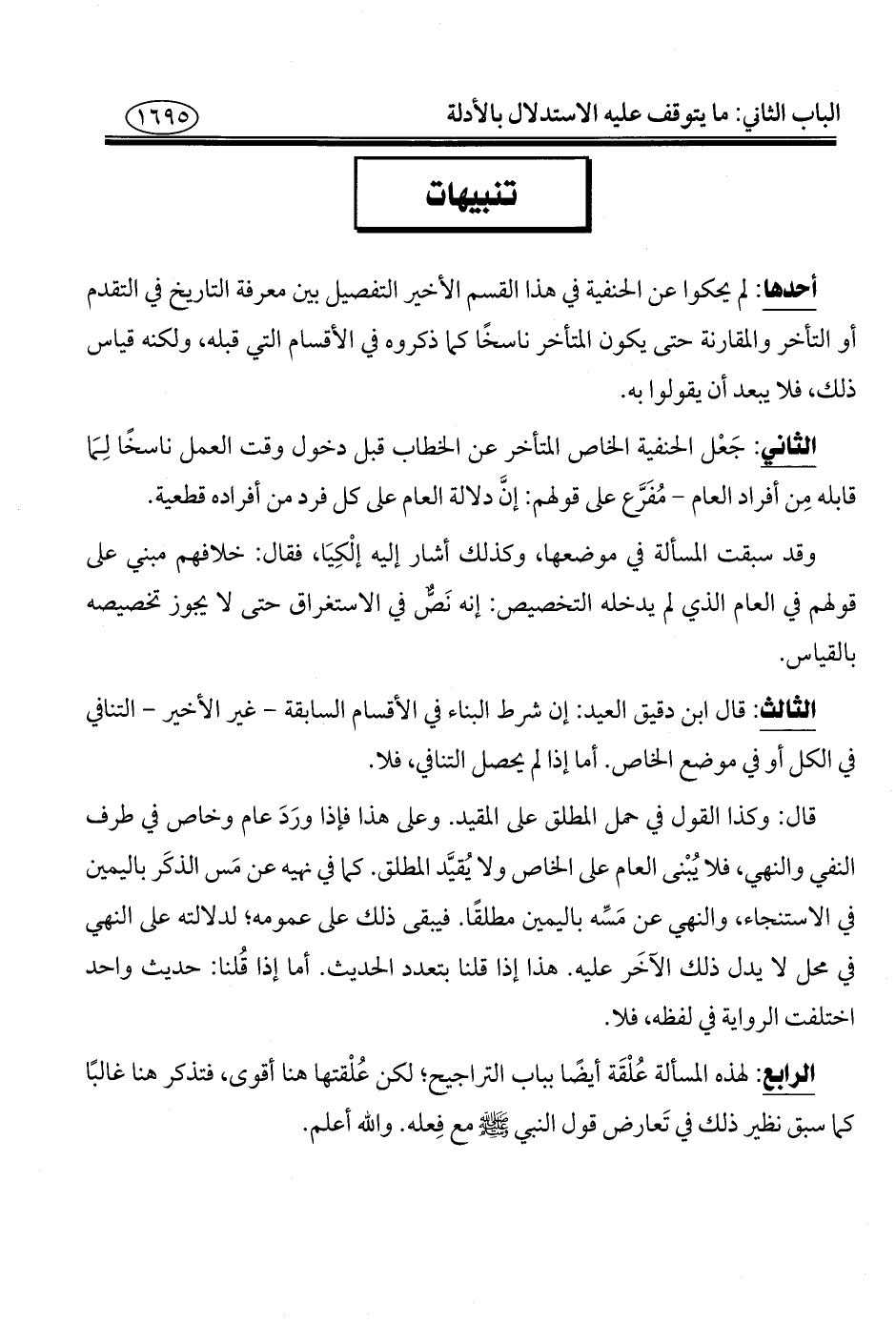 الثالث: قال ابن دقيق العيد: إن شرط البناء في الأقسام السابقة -غير الأخير- التنافي في الكل أو في موضع الخاص. أما إذا لم يحصل التنافي، فلا.