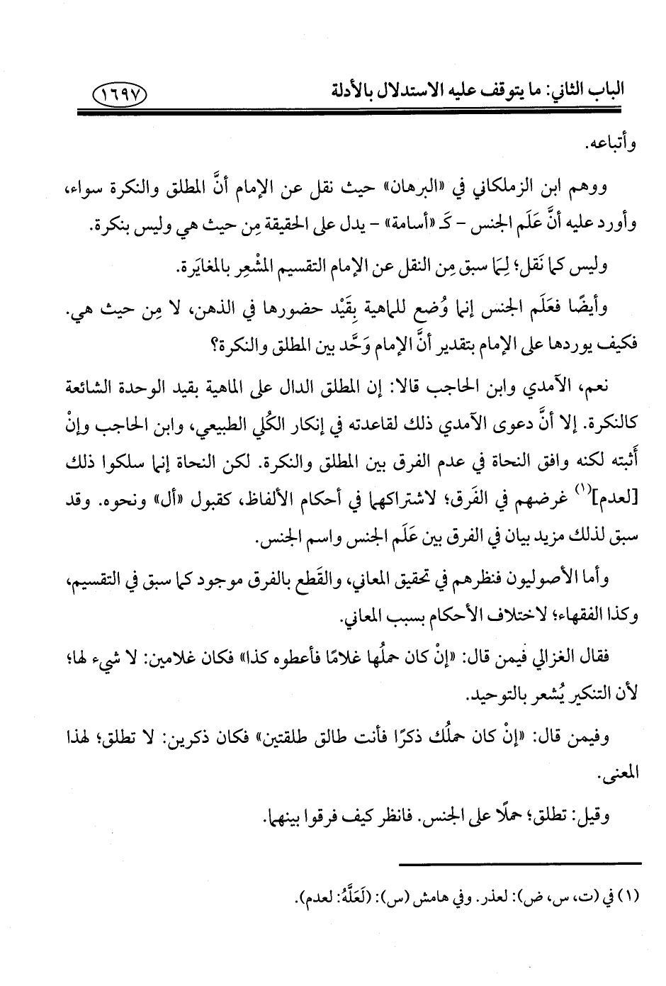 ووهم ابن الزملكاني في "البرهان" حيث نقل عن الإِمام أنَّ المطلق والنكرة سواء، وأورد عليه أنَّ عَلَم الجنس -كَـ "أسامة"- يدل على الحقيقة مِن حيث هي وليس بنكرة.