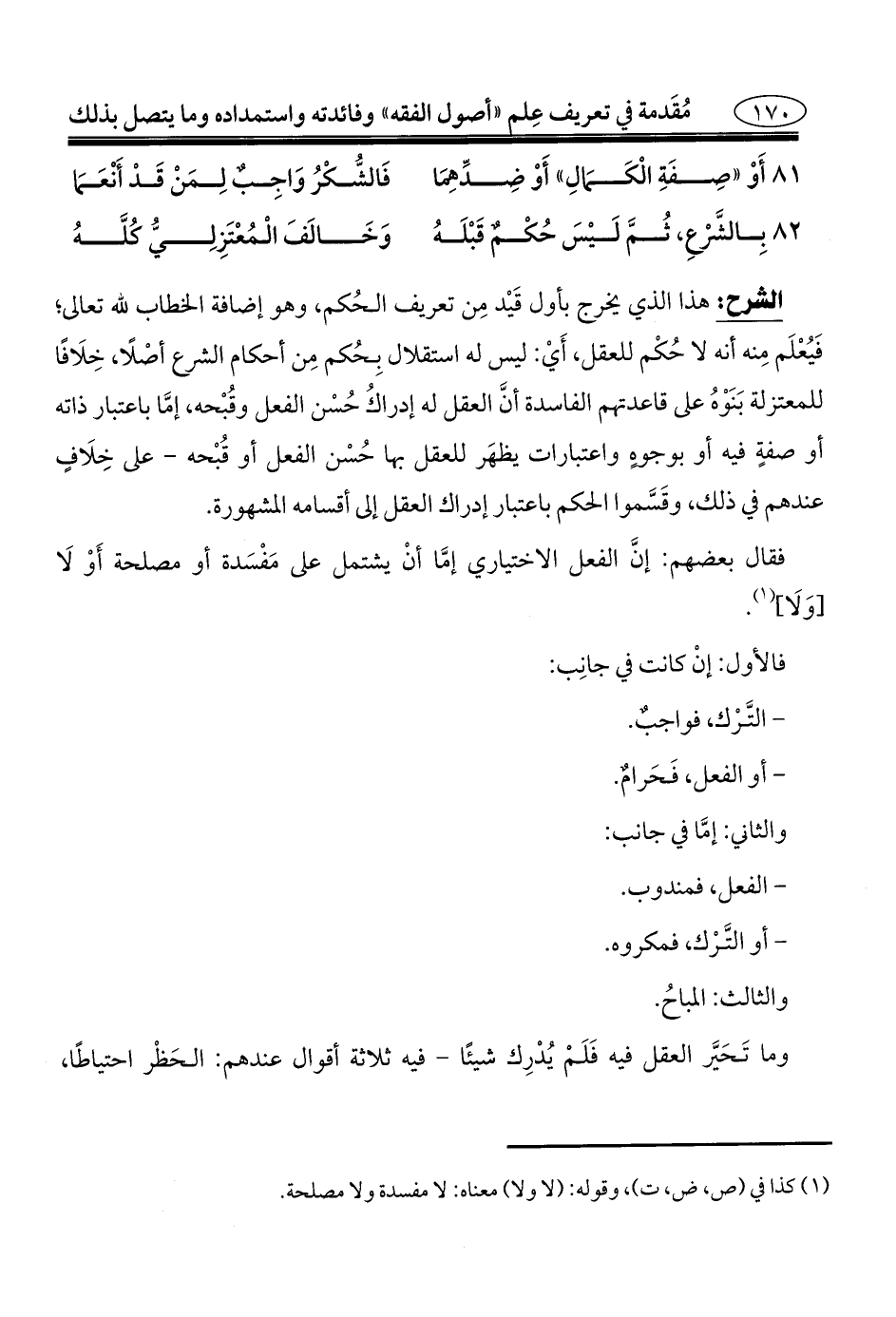 ٨١ - أَوْ "صِفَةِ الْكَمَالِ" أَوْ ضِدِّهِمَا ... فَالشُّكْرُ وَاجِبٌ لِمَنْ قَدْ أَنْعَمَا