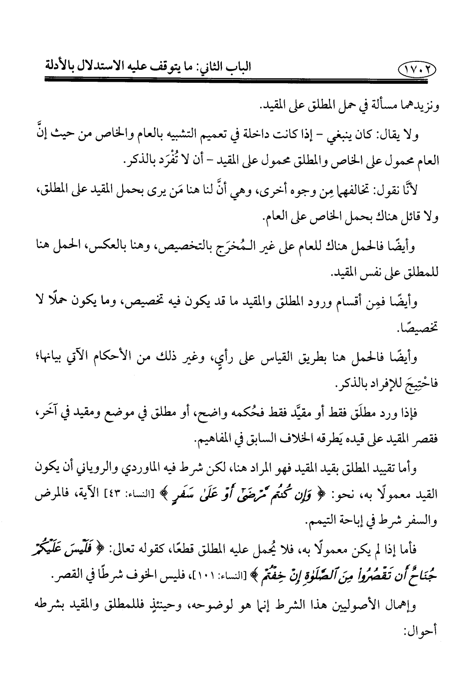 وأما تقييد المطلق بقيد المقيد فهو المراد هنا، لكن شرط فيه الماوردي والروياني أن يكون القيد معمولًا به، نحو: {وَإِنْ كُنْتُمْ مَرْضَى أَوْ عَلَى سَفَرٍ} [النساء: ٤٣] الآية، فالمرض والسفر شرط في إباحة التيمم.