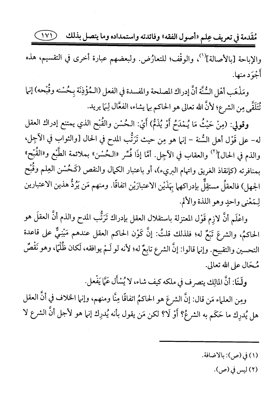 وقولي: (مِنْ حَيْثُ مَا يُمْدَحُ أَوْ يُذَمُّ) أَيْ: الحُسْن والقُبْح الذي يمتنع إدراك العقل له - على قَوْل أهل السُّنة - إنما هو مِن حيث تَرَتُّب المدح في الحال [والثواب في الآجِل، والذم في الحال] (¬٢) والعقاب في الآجِل. أمَّا إذَا فُسِّر "الحُسْن" بملائمة الطَّبْع و"القُبْح" بمنافرته (كإنقاذ الغريق واتهام البريء)، أو باعتبار الكمال والنقص (كَحُسْن العِلم وقُبْح الجهل) فالعقلُ مستقِلٌّ بإدراكهما بِهَذَيْن الاعتبارَيْن اتفاقًا. ومنهم مَن يَرُدُّ هذين الاعتبارين لِمَعْنى واحدٍ وهو اللذة والألم.