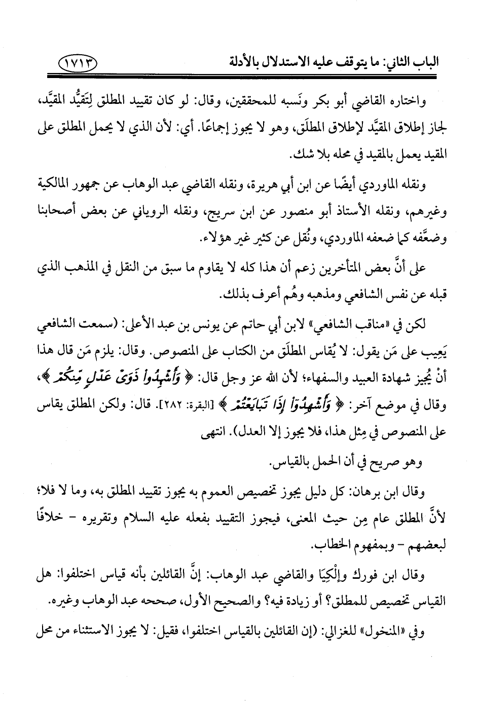 لكن في "مناقب الشافعي" لابن أبي حاتم عن يونس بن عبد الأعلى: (سمعت الشافعي يَعِيب على مَن يقول: لا يُقاس المطلَق من الكتاب على المنصوص. وقال: يلزم مَن قال هذا أنْ يُجيز شهادة العبيد والسفهاء؛ لأن الله عَزَّ وَجَلَّ قال: {وَأَشْهِدُوا ذَوَيْ عَدْلٍ مِنْكُمْ}، وقال في موضع آخر: {وَأَشْهِدُوا إِذَا تَبَايَعْتُمْ} [البقرة: ٢٨٢]. قال: ولكن المطلق يقاس على المنصوص في مِثل هذا، فلا يجوز إلا العدل). انتهى