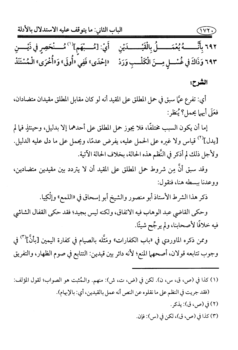 (¬١) كذا في (ص، ق، س، ن). لكن في (ض، ت، ش): منهم. والمُثبت هو الصواب؛ لقول المؤلف: (فقد جريت في النظم على ما نقلوه عن النَّصُّ أنَّه عمل بالقيدين، أي: بالإبهام).