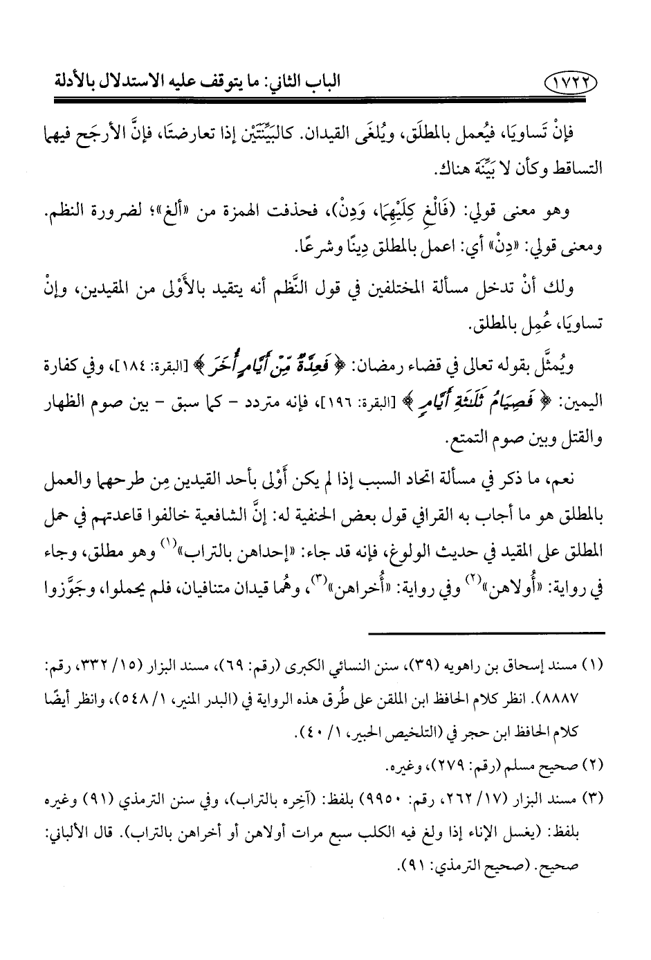 وهو معنى قولي: (فَالْغِ كِلَيْهِمَا، وَدِنْ)، فحذفت الهمزة من "ألغ"؛ لضرورة النظم. ومعنى قولي: "دِنْ" أي: اعمل بالمطلق دِينًا وشرعًا.
