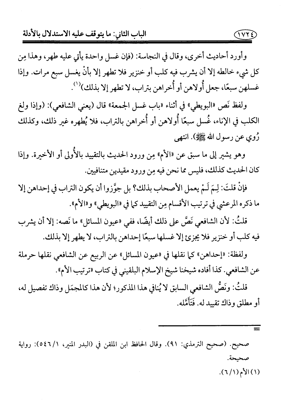 وأورد أحاديث أخرى، وقال في النجاسة: (فإن غسل واحدة يأتي عليه طهر، وهذا مِن كل شيء خالطه إلَّا أن يشرب فيه كلب أو خنزير فلا تطهر إلَّا بأنْ يغسل سبع مرات. وإذا غسلهن سبعًا، جعل أُولاهن أو أُخراهن بتراب، لا تطهر إلَّا بذلك) (¬١).