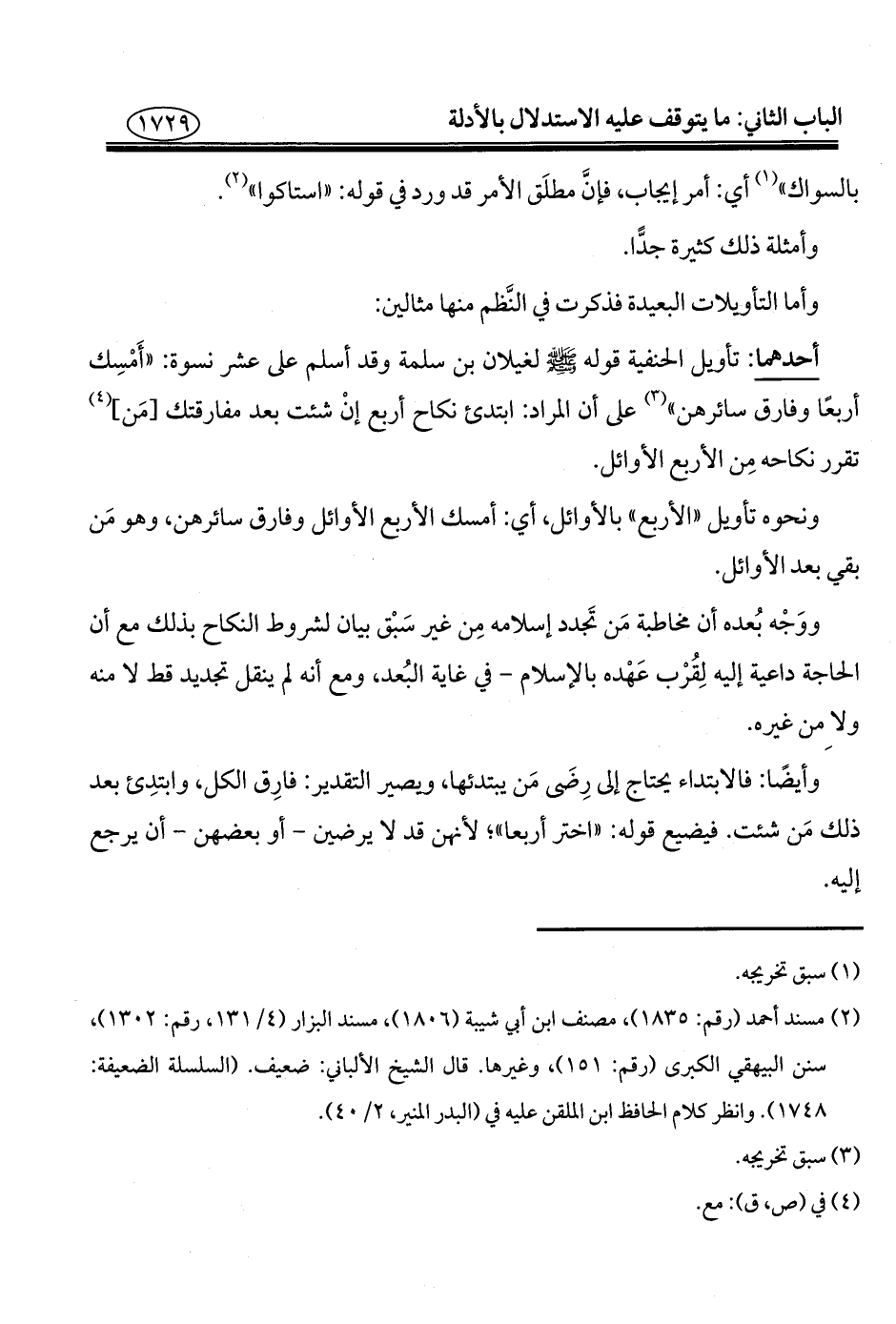 أحدهما: تأويل الحنفية قوله - صلى الله عليه وسلم - لغيلان بن سلمة وقد أسلم على عشر نسوة: "أَمْسِك أربعًا وفارق سائرهن" (¬٣) على أن المراد: ابتدئ نكاح أربع إنْ شئت بعد مفارقتك [مَن] (¬٤) تقرر نكاحه مِن الأربع الأوائل.