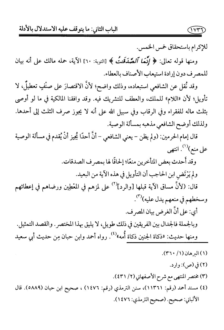 وقد نُقل عن الشَّافعي استبعاده، وذلك واضح؛ لأنَّ الاقتصارَ على صنْفٍ تعطيلٌ، لا تأويل؛ لأنَّ "اللام" للملك، والعطف للتشريك فيه. وقد وافقنا المالكيّة في ما لو أوصى بثلث ماله للفقراء وفي الرقاب وفي سبيل الله على أنَّه لا يجوز صرف الثلث إلى أحدها. ولذلك أوضح الشَّافعي مذهبه بمسألة الوصيَّة.