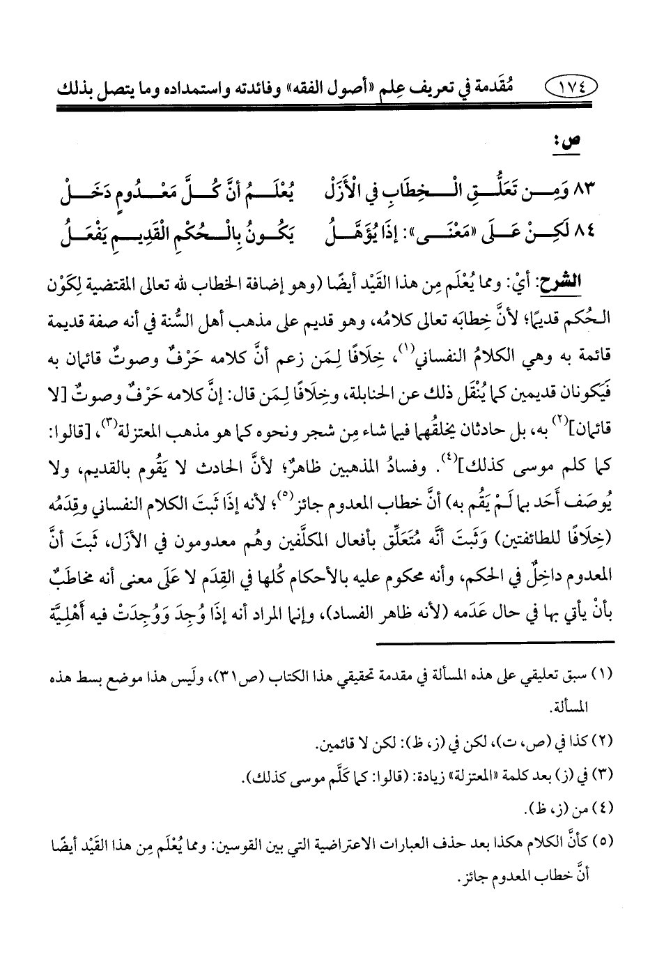 ٨٣ - وَمِن تَعَلُّقِ الْخِطَابِ في الْأَزَلْ ... يُعْلَمُ أنَّ كُلَّ مَعْدُومٍ دَخَلْ