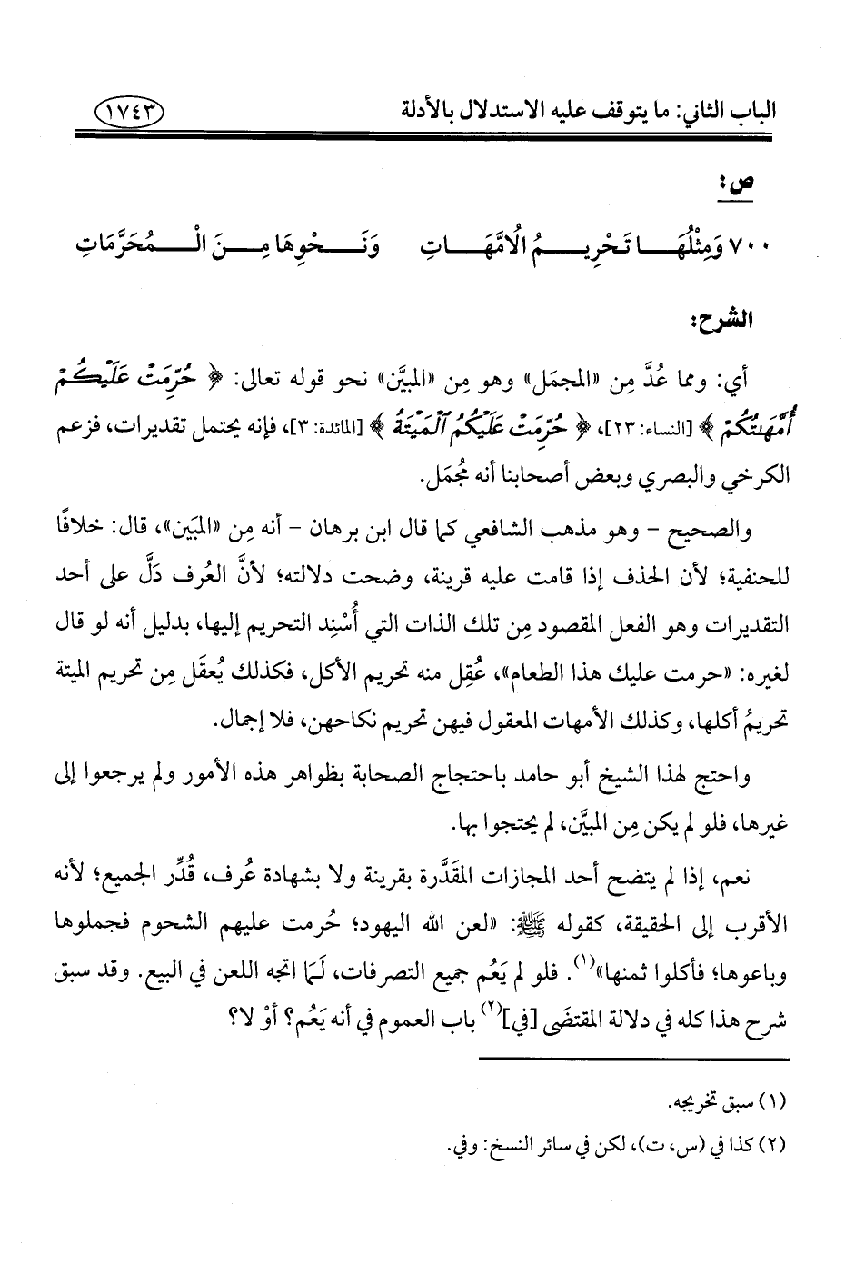 ٧٠٠ - وَمثْلُهَا تَحْرِيمُ الُامَّهَاتِ ... وَنَحْوِهَا مِنَ الْمُحَرَّمَاتِ