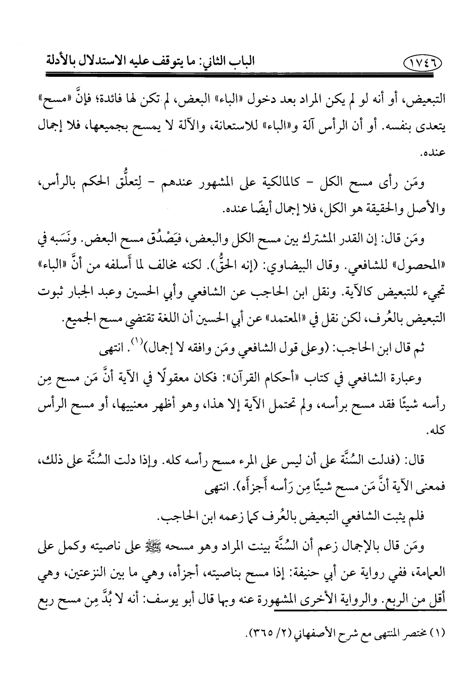 ومَن قال: إن القدر المشترك بين مسح الكل والبعض، فيَصْدُق مسح البعض. ونَسَبه في "المحصول" للشافعي. وقال البيضاوي: (إنَّه الحقُّ). لكنَّه مخالف لما أسلفه من أنَّ "الباء" تجيء للتبعيض كالآية. ونقل ابن الحاجب عن الشَّافعي وأبي الحسين وعبد الجبار ثبوت التبعيض بالعُرف، لكن نقل في "المعتمد" عن أبي الحسين أن اللُّغة تقتضي مسح الجميع.