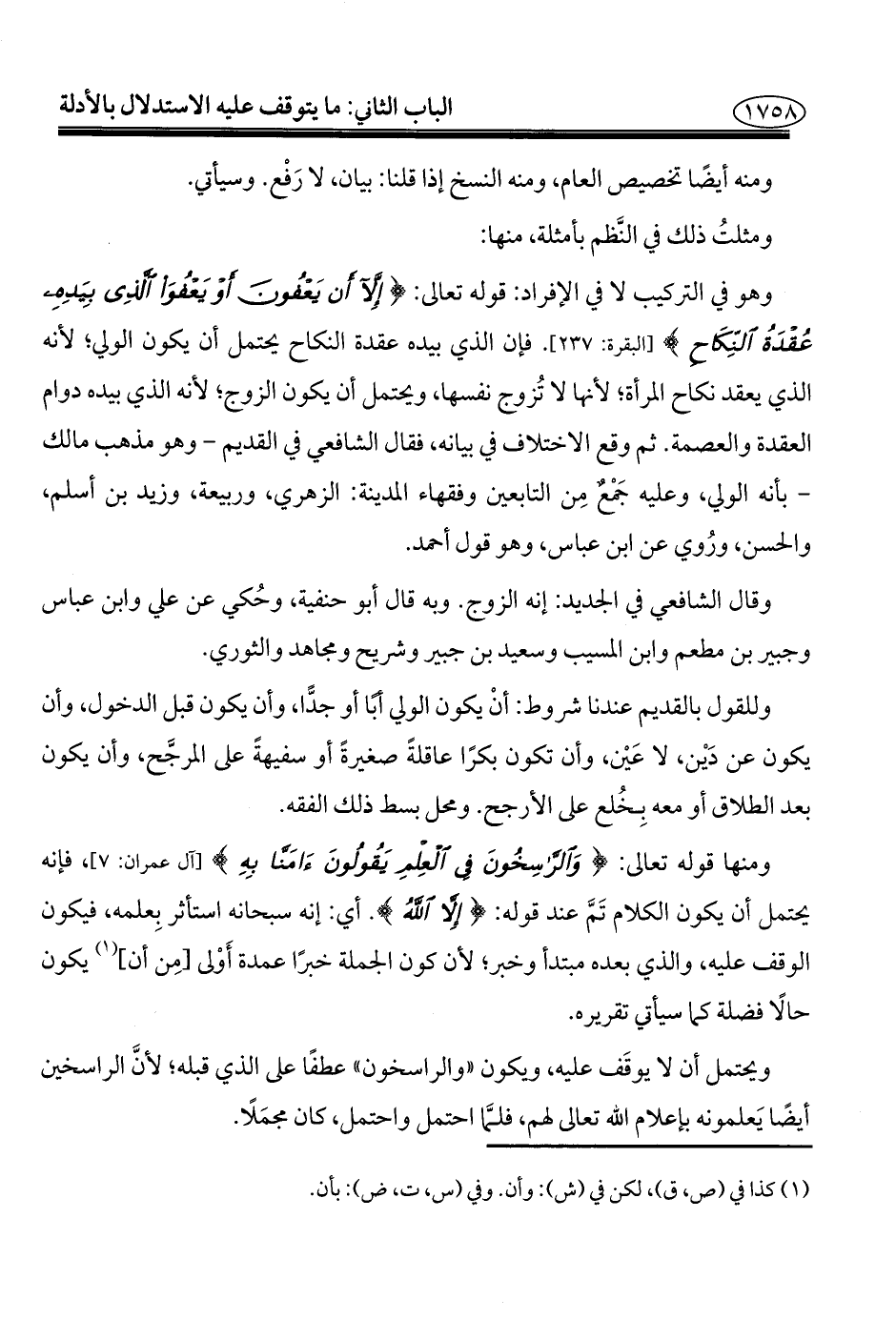 ويحتمل أن لا يوقَف عليه، ويكون "والراسخون" عطفًا على الذي قبله؛ لأنَّ الراسخين أيضاً يَعلمونه بإعلام الله تعالى لهم، فلمَّا احتمل واحتمل، كان مجمَلًا.