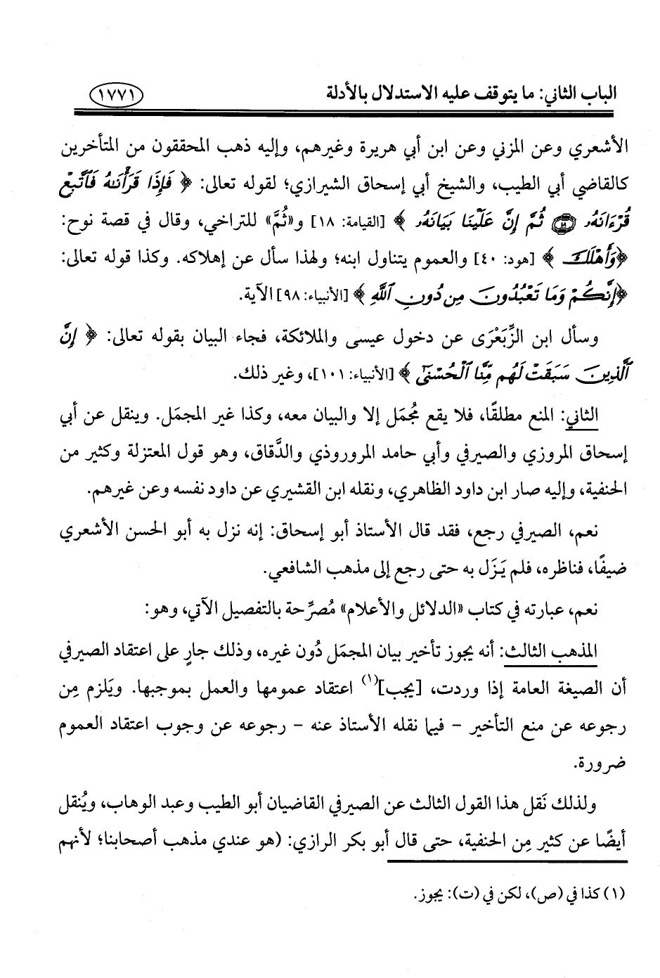 الأشعري وعن المزني وعن ابن أبي هريرة وغيرهم، وإليه ذهب المحققون من المتأخرين كالقاضي أبي الطيب، والشيخ أبي إسحاق الشيىرازي؛ لقوله تعالى: {فَإِذَا قَرَأْنَاهُ فَاتَّبِعْ قُرْآنَهُ (١٨) ثُمَّ إِنَّ عَلَيْنَا بَيَانَهُ} [القيامة: ١٨] و"ثُمَّ" للتراخي، وقال في قصة نوح: {وَأَهْلَكَ} [هود: ٤٠] والعموم يتناول ابنه؛ ولهذا سأل عن إهلاكه. وكذا قوله تعالى: {إِنَّكُمْ وَمَا تَعْبُدُونَ مِنْ دُونِ اللَّهِ} [الأنبياء: ٩٨] الآية.