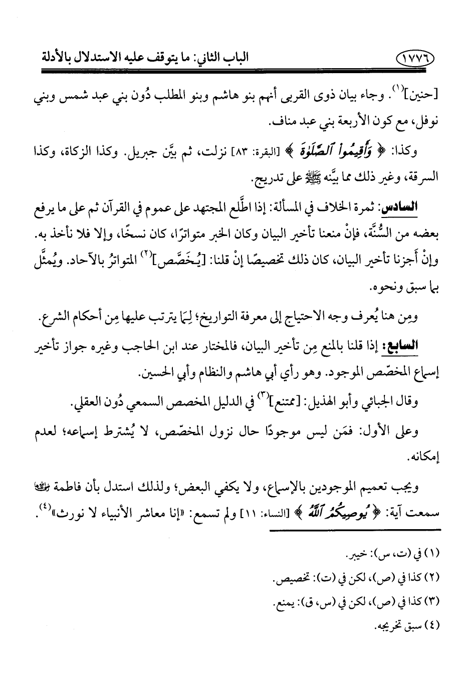 السادس: ثمرة الخلاف في المسألة: إذا اطَّلع المجتهد على عموم في القرآن ثم على ما يرفع بعضه من السُّنَّة، فإنْ منعنا تأخير البيان وكان الخبر متواترًا، كان نسخًا، وإلا فلا نأخذ به. وإنْ أَجزنا تأخير البيان، كان ذلك تخصيصًا إنْ قلنا: [يُخَصَّص] (¬٢) المتواترُ بالآحاد. ويُمثَّل بما سبق ونحوه.