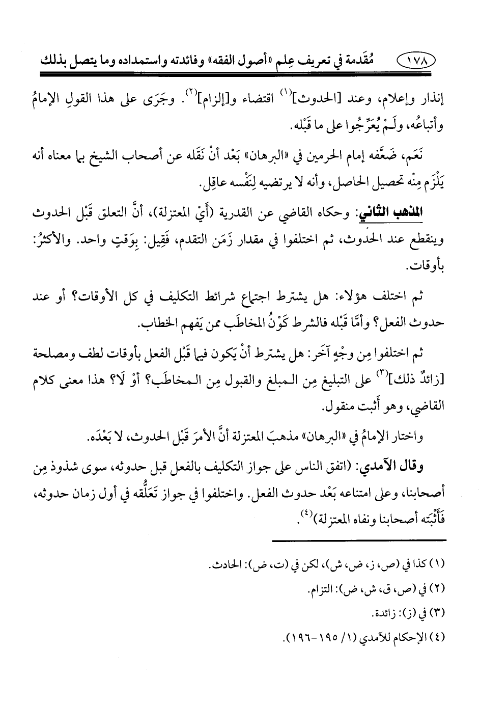 وقال الآمدي: (اتفق الناس على جواز التكليف بالفعل قبل حدوثه، سوى شذوذ مِن أصحابنا، وعلى امتناعه بَعْد حدوث الفعل. واختلفوا في جواز تَعَلُّقه في أول زمان حدوثه، فَأَثْبَته أصحابنا ونفاه المعتزلة) (¬٤).
