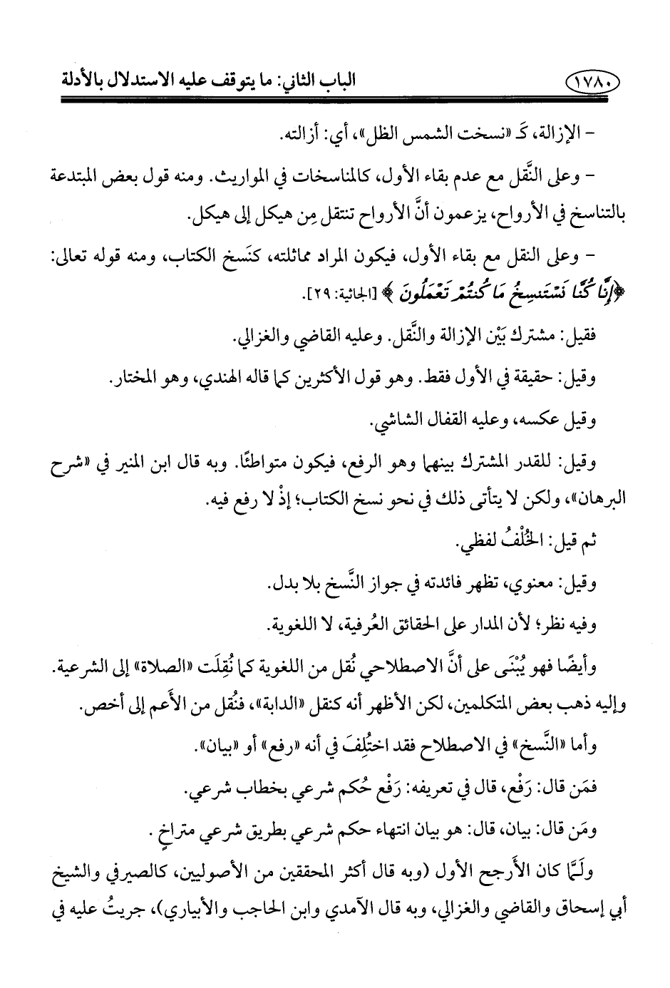 وأيضًا فهو يُبْنَى على أنَّ الاصطلاحي نُقل من اللغوية كما نُقِلَت "الصلاة" إلى الشرعية. وإليه ذهب بعض المتكلمين، لكن الأظهر أنه كنقل "الدابة"، فنُقل من الأَعم إلى أخص.