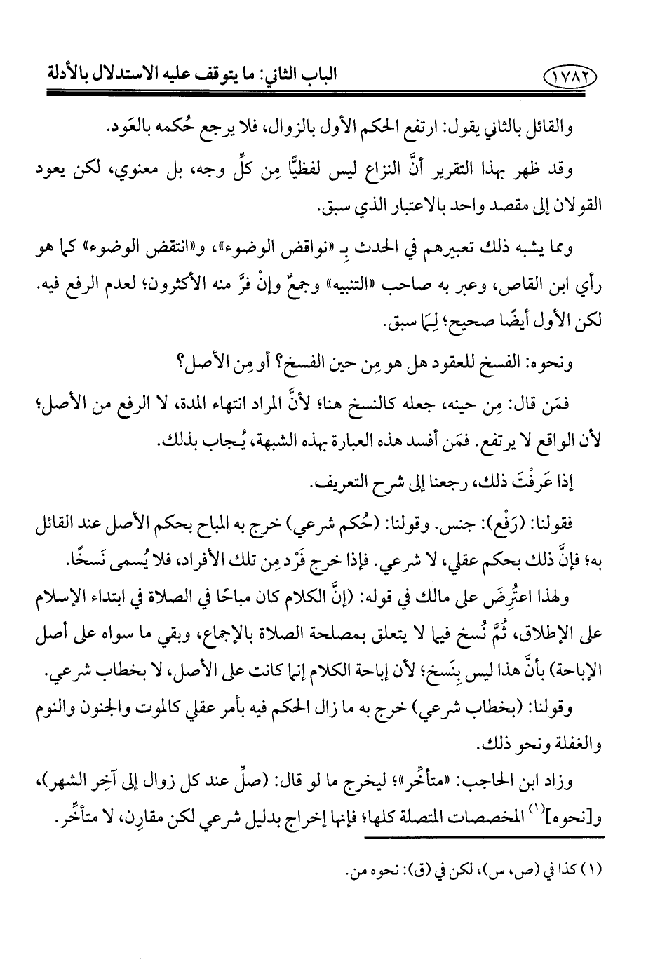 ولهذا اعتُرِضَ على مالك في قوله: (إنَّ الكلام كان مباحًا في الصلاة في ابتداء الإسلام على الإطلاق، ثُمَّ نُسخ فيما لا يتعلق بمصلحة الصلاة بالإجماع، وبقي ما سواه على أصل الإباحة) بأنَّ هذا ليس بِنَسخ؛ لأن إباحة الكلام إنما كانت على الأصل، لا بخطاب شرعي.