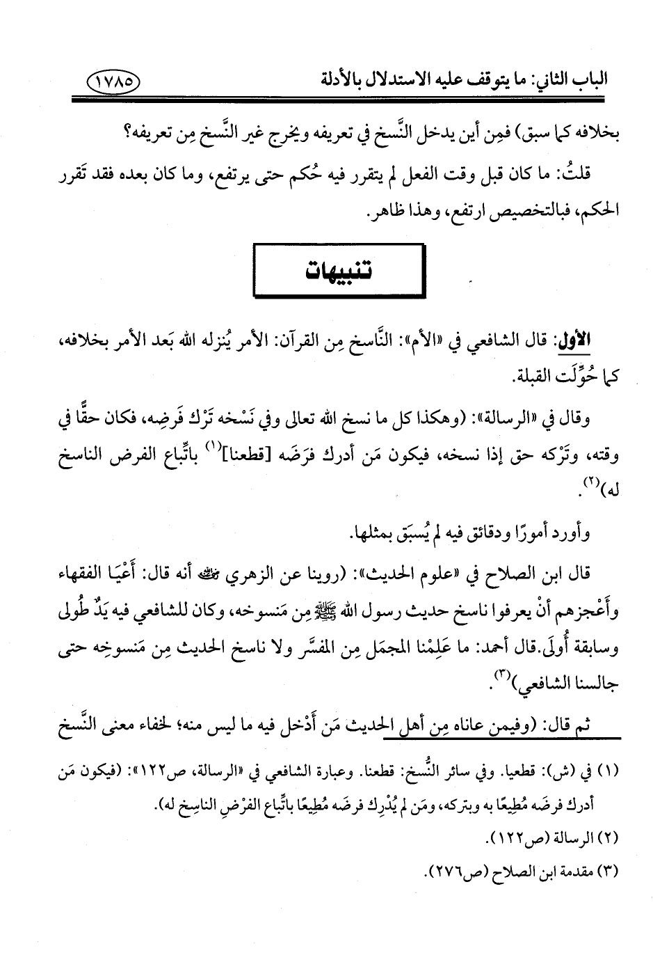 قال ابن الصلاح في "علوم الحديث": (روينا عن الزهري - رضي الله عنه - أنه قال: أَعْيَا الفقهاء وأَعْجزهم أنْ يعرفوا ناسخ حديث رسول الله - صلى الله عليه وسلم - مِن مَنسوخه، وكان للشافعي فيه يَدٌ طُولى وسابقة أُولَى. قال أحمد: ما عَلِمْنا المجمَل مِن المفسَّر ولا ناسخ الحديث مِن مَنسوخِه حتى جالسنا الشافعي) (¬٣).