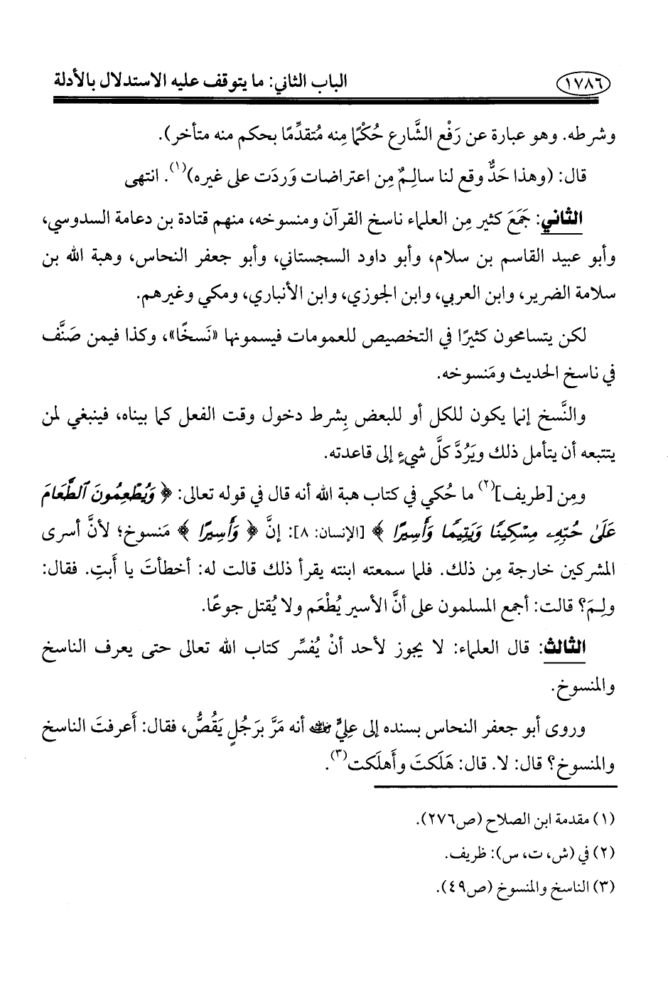 الثالث: قال العلماء: لا يجوز لأحد أنْ يُفسِّر كتاب الله تعالى حتى يعرف الناسخ والمنسوخ.