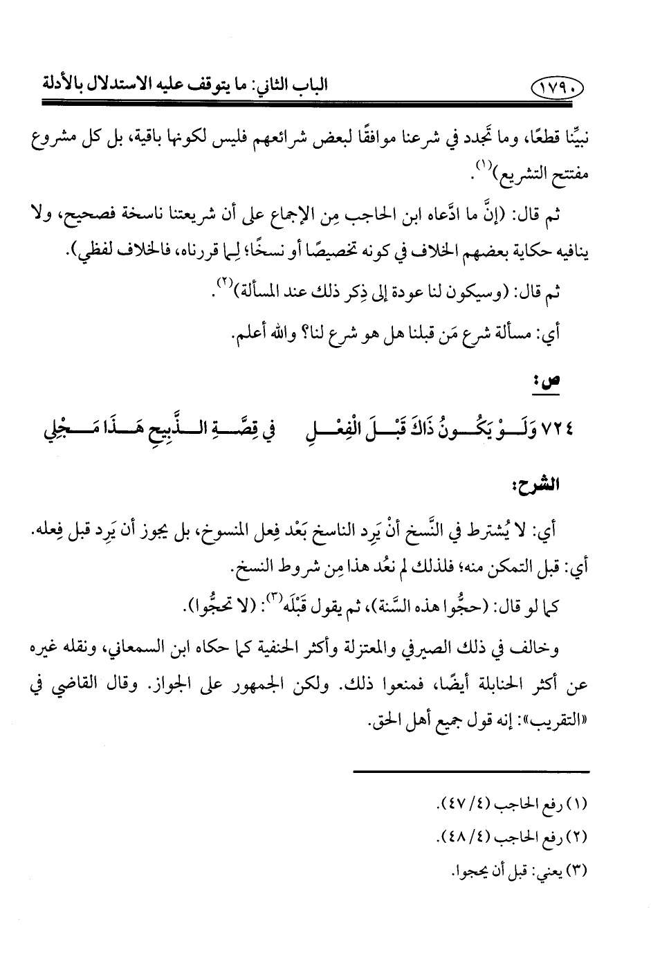ثم قال: (إنَّ ما ادَّعاه ابن الحاجب مِن الإجماع على أن شريعتنا ناسخة فصحيح، ولا ينافيه حكاية بعضهم الخلاف في كونه تخصيصًا أو نسخًا؛ لِما قررناه، فالخلاف لفظي).